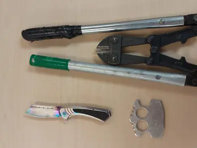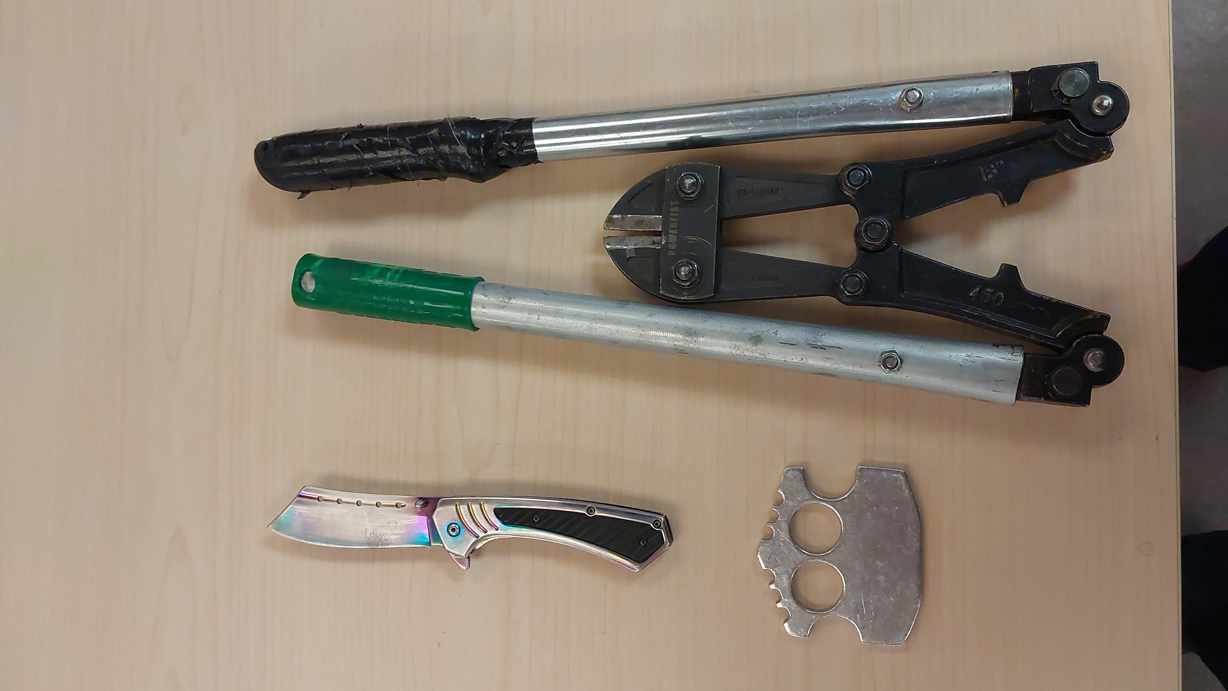Both suspects were arrested and upon being searched officers located a number of items and weapons in the suspect’s possession. Along with some of the items believed to have been taken from porches in the area, officers also seized a can of bear spray, brass knuckles, a switchblade and two sets of bolt cutters.