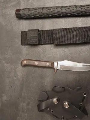 A search of the individual incident to arrest revealed the individual was in possession of weapons and was concealing them inside a bag they had in their possession. Officers seized a collapsible baton, baton holder, large buck knife and knife sheath from the individual.
