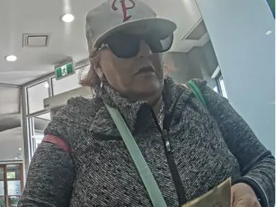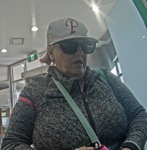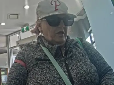 The suspect is described as middle aged, wearing a Philadelphia Phillies ball cap, black oversized sunglasses and a grey top.