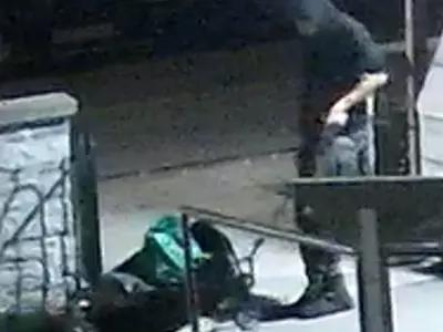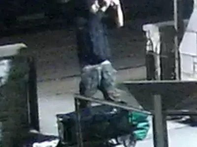 The suspect is described as a tall Caucasian male with black hair and a short black beard. The suspect was pulling a black canvas wagon at the time of the incident.