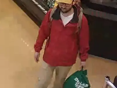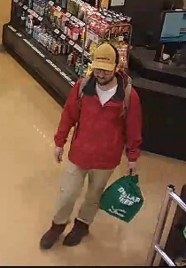 The suspect is described as a white male with a brown beard. At the time of the incident the suspect was wearing a yellow and black ball cap, a red jacket, khaki pants and dark colored footwear. The suspect was also carrying a back pack and a green re-useable bag from the Dollar Tree.