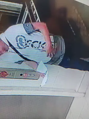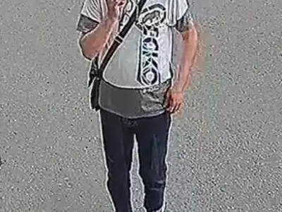 The suspect is described as a Caucasian male, 35- 50 years old, approximately 6 feet tall, 200-225lbs, with short white hair and a white scruffy beard, wearing black pants, a grey t-shirt with a white sleeveless hoodie overtop, a white baseball cap and blue running shoes