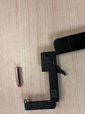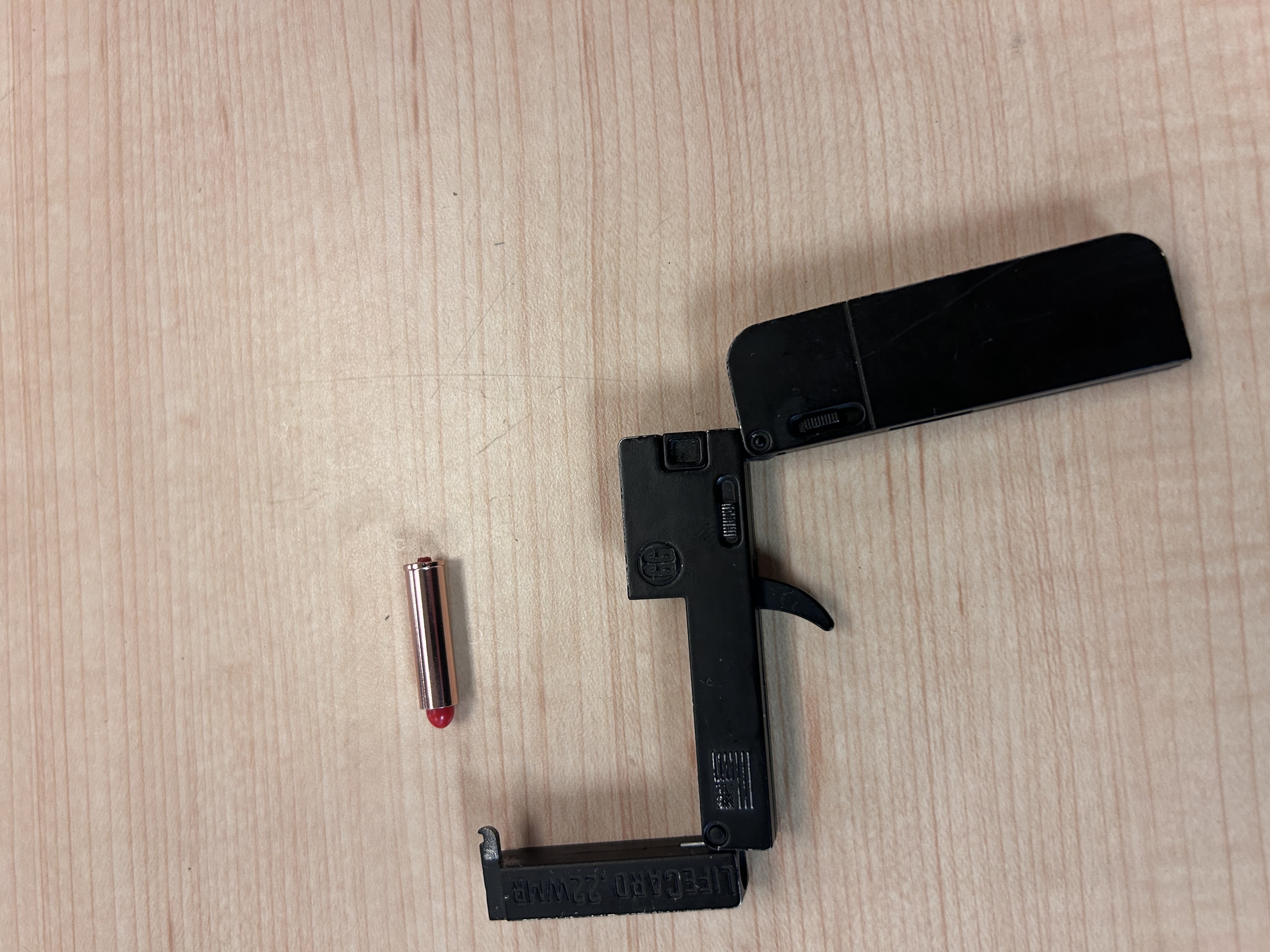 Upon searching the individual officers located a small black rectangular object which was later determined to be a .22 caliber, single shot pistol.